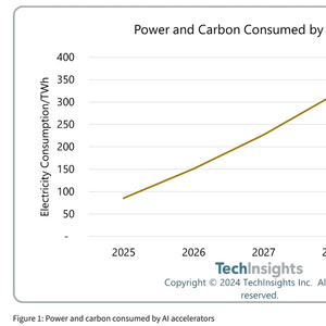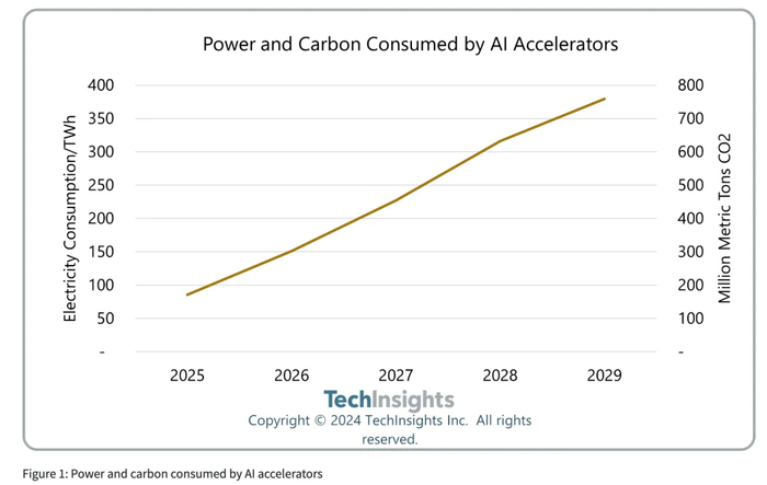 TechInsights表示,根据美国能源信息署的数据,2025年至2029年期间,全球耗电量将达到153,000太瓦时。这意味着AI芯片将占未来五年用电量的1.5%,是全球能源消耗的重要组成部分。