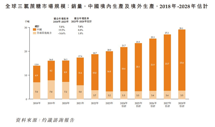 据灼识咨询报告,全球三氯蔗糖市场规模从2018年的13.9千吨增长至2023年的20.0千吨,年均复合增长率为7.5%,并预计在2028年达到29.1千吨,未来五年的年均复合增长率为7.8%。其中,中国境内生产的三氯蔗糖销量从2018年的6.9千吨增长至2023年的16.8千吨,年均复合增长率为19.5%,并预计在2028年达到25.6千吨,未来五年的年均复合增长率为8.8%。