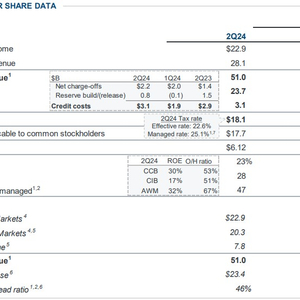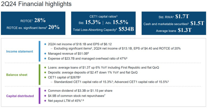 在计入Visa股票收益和其他可自由支配项目后,有形普通股股本回报率(ROTCE)为20%。戴蒙指出,该公司的资本状况强劲,CET1比率为15.3%,并提到董事会打算今年第二次增加普通股股息,与2023年第四季度相比累计增长19%。