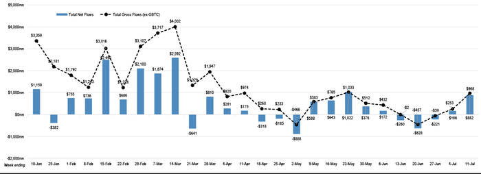 在世界上最大市值加密货币——比特币的交易价格在一周前跌至2月份以来的最低水平后,美股的“逢低买入”群体大举回归价格同样经历大幅下跌的比特币ETF,美股市场的比特币ETF斩获一个多月来最大规模的资金流入量,这也是自本周以来比特币价格反弹的重要催化剂。摩根大通(JPMorgan)的统计数据显示,在截至7月11日的一周内,比特币现货ETF的总净流入量高达8.82亿美元,平均每天流入1.75亿美元。这是自截至5月23日以来流入资金最多的一周。