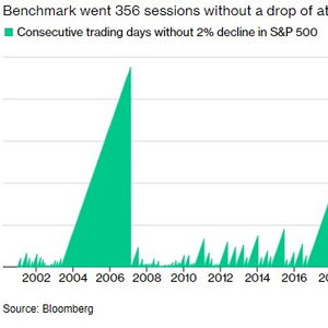 随着科技股的大幅抛售,标普500指数遭遇了自2022年12月以来最严重的单日跌幅,打破了自2007年全球金融危机以来一直保持的记录——从未出现过2%以上的单日下跌。据数据显示,周三美股基准指数下跌了2.3%,此前的356个交易日,该指数的跌幅都未曾超过2%,这一表现创下了17年来的最长纪录。该指数在上周曾一度超越200日移动平均线15%,这一关键水平历史上曾预示着市场抛售。