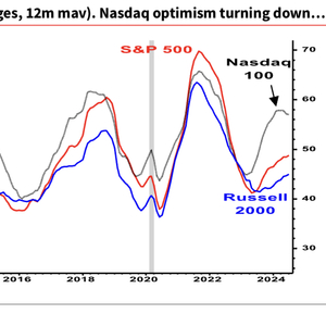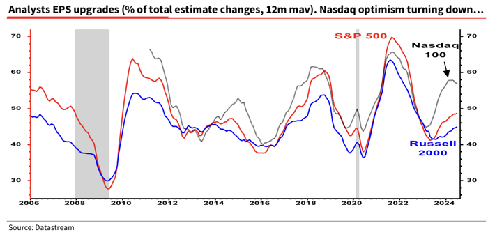 “什么可能将戳破科技股泡沫?非常简单的每股收益乐观情绪下降趋势可能就奏效了。”他分享了一张图表,显示纳斯达克100指数成分股的整体每股收益上调幅度降温,而标普500指数和罗素2000指数成分股的整体每股收益仍在经历小幅上调,暗示华尔街分析师们对大型科技公司能够实现多少盈利增长开始持冷静态度。