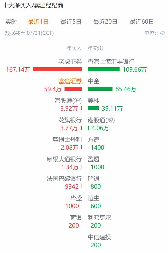 智通财经观察到,7月31日,科笛获老虎证券买入167.14万股,为第一大买入者;富途证券和港股通分别买入59.4万股及3.92万股,各列入第二、三大买入者席位。有买就有卖,卖方席位来看,香港上海汇丰银行为最大卖出者,当日共计卖出109.66万股;中金和美林为第二、三大卖方,分别卖出89.46万股、39.11万股。对比来看,买方席位较卖方量更小且散户居多。