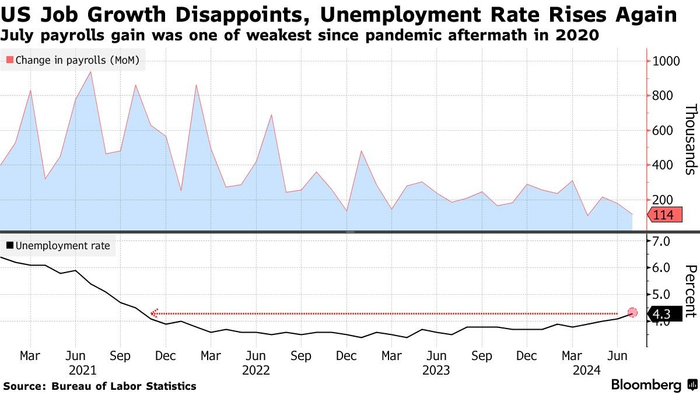 上周五公布的美国非农就业报告意外爆冷,7月非农新增就业11.4万人,预期17.5万,前值下修至17.9万。其中最值得关注的是,美国最新的失业率超预期上行至4.3%,萨姆规则被再次触发——即当美国失业率的三个月移动平均值比过去12个月的低点上升了0.5个百分点或更多时,这通常标志着美国已经进入了经济衰退的早期阶段。