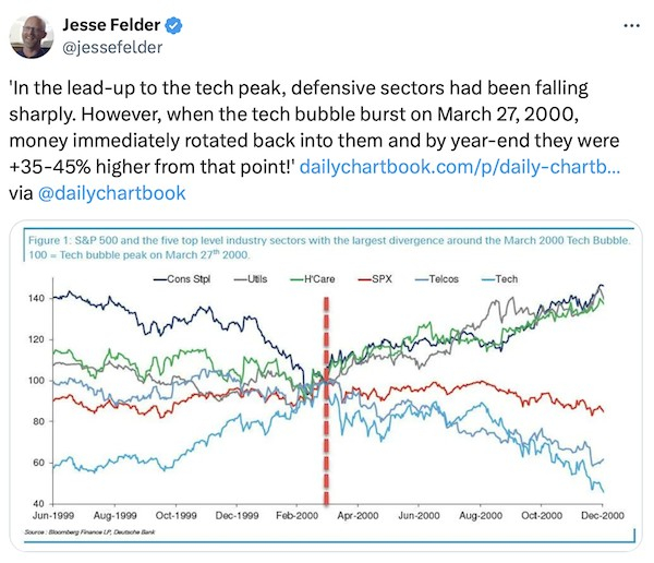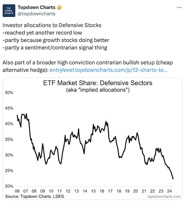 近来在AI热潮的推动下,追逐大型科技股的投资者已将他们在整个股市中的权重推到了一个极端,超过了互联网泡沫鼎盛时期创下的峰值。另一方面,投资者投资组合中的防御型板块,它们现在所占的份额是有记录以来最小的。