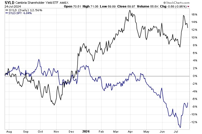 另一只名为“Cambria Shareholder Yield ETF” (美股代码:SYLD)的ETF也值得关注——过去12个月的股息收益率比标普500指数的1.97%高出约半个百分点。根据发行人的说法,SYLD专注于通过三个操作向股东返还现金的美国公司:股息、回购和净债务削减。由于公司回购通常不会引发投资者的应税事项,因此与严格意义上的高股息支付ETF相比,这只基金可以被认为更省税。该回报方法还可以帮助投资者度过重大的市场低迷时期。该基金管理的总资产已膨胀至12.2亿美元。