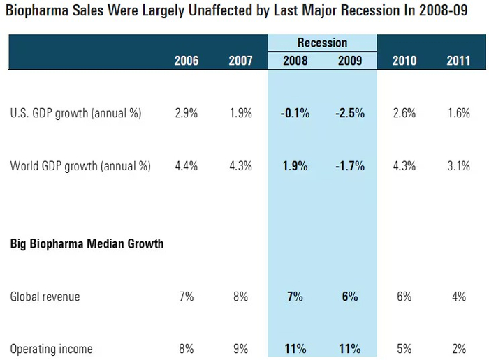 医疗保健板块因其与经济周期关联度较低,在经济衰退期间的股价表现通常跑赢大盘。例如,在2009年的全球经济衰退中,制药和生物技术行业公布了稳定的业绩,对销售和利润的影响有限。