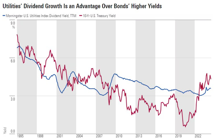 公用事业公司提供电力、天然气和水等基本服务,需求弹性较小,因此在经济不确定性时具有一定程度的防御性。根据晨星公司数据,几乎所有公用事业公司都预计年盈利增长至少6%。该行业3.6%的收益率与利率相比具有历史竞争力。