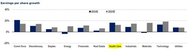 最新的财报季也显示出该板块公司业绩的稳定。上周,医疗行业有21家公司公布了季度收益,其中19家公司的季度利润超过了预期。在收入方面,5家公司的收入低于预期,其余公司的收入超过预期。标普500医疗保健指数成份股中有41家公司已公布了业绩,其中88%的公司利润超过预期,78%的公司收入超过预期。医疗保健行业仍是其他行业中每股收益增长最高的行业之一。