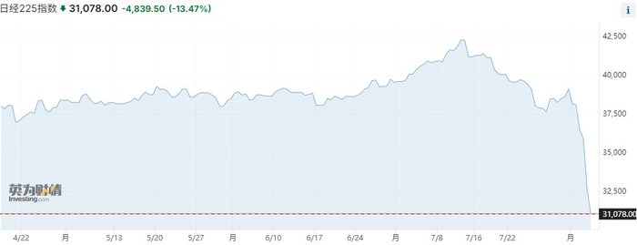 周一全球股市继续遭重挫:MSCI新兴市场指数跌超3%,创2022年6月来最大。日本股市领跌,日经225指数收跌12%,盘中一度跌超13%,三天跌去了近一年的涨幅;东证指数收跌12%,创1987年以来最大单日跌幅,盘中多次触发熔断机制。韩国KOSPI指数收盘跌8.8%,创下2008年以来最大跌幅,盘中曾触发熔断。