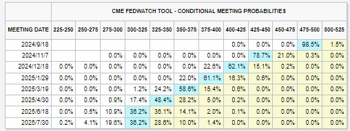 在美国经济数据扎堆走弱后,市场对美联储的降息预期也跟着升温。数据公布之后,CME 美联储观察工具显示,交易商目前认为美联储在9月份降息50个基点的概率为98.5%,远高于数据公布前的31%。交易商已完全消化9月份降息至少25个基点的预期,目前预计年底前将累计降息120个基点。