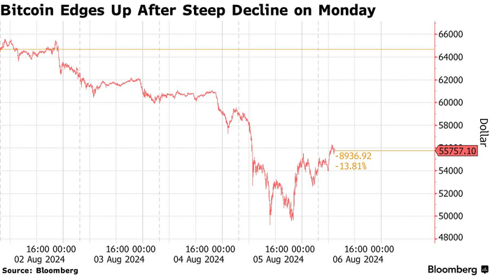 在周二亚盘交易时间段,随着日韩股票市场在风险偏好回升的刺激之下实现大涨,且向上触及熔断机制,全球最大规模加密资产比特币顺势涨超8%,从周一全球股市暴跌引发的风险资产抛售浪潮中逐渐恢复过来,周一比特币一度跌至5万美元以下,而市值排名第二的以太坊则遭遇了自2022年FTX加密帝国崩塌事件以来最大跌幅。截至发稿,比特币交易价格在逢低买盘支撑下稳定在为 55,900美元附近,涨超8%;加密货币总市值排名第二的以太坊价格则超过 2500 美元,今日涨幅一度超10%。