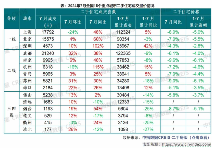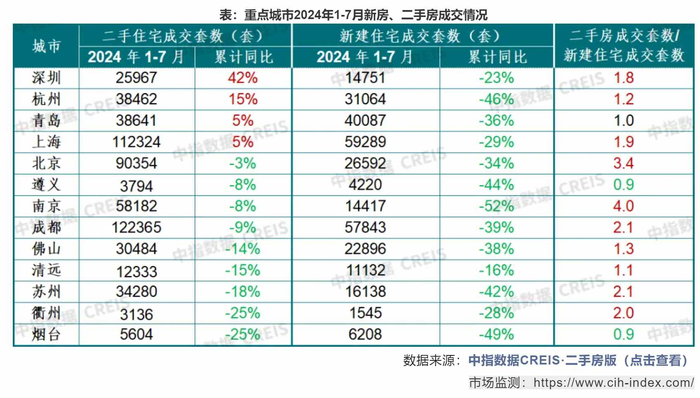 从重点城市成交来看,2024年1-7月,二手房市场表现普遍优于新房:上海、深圳、杭州、青岛二手房同比均增长,新房同比下降;北京、南京、成都、佛山二手房累计降幅在一成左右,新房销售累计降幅均超三成。