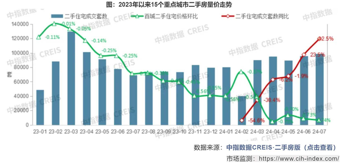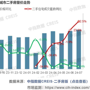 根据中指数据,2024年1-7月,重点15城二手房住宅成交59.0万套,同比下降2.8%,7月成交9.9万套,环比增长2.9%,同比增长42.5%。价格方面,根据中指百城价格指数,2024年7月,百城二手住宅均价环比下跌0.74%,已连续27个月环比下跌,同比下跌6.58%。