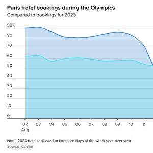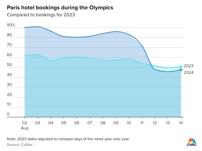 尽管7月初巴黎酒店经营状况并不太好,入住率估计下降了60%,这促使酒店开始打折,但这一趋势在奥运会期间出现逆转。根据全球房地产数据公司CoStar的数据,奥运会期间巴黎酒店的入住率较去年同期有所上升,但在闭幕式的几天里,巴黎的酒店预订量预计将同比下降。