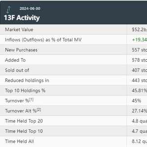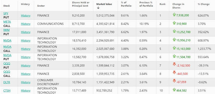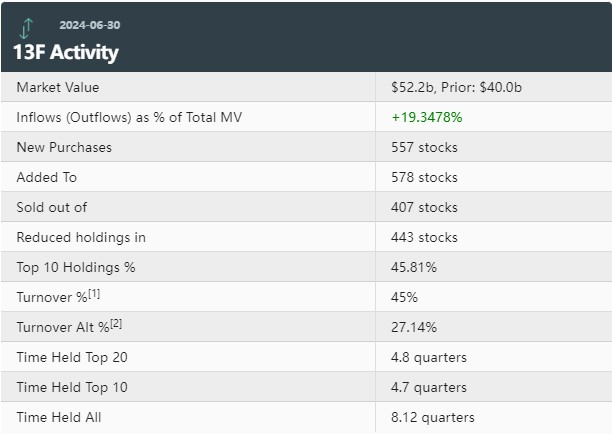 最新数据显示,野村Q2持仓总市值为522亿美元,上一季度为400亿美元,环比增长19.35%。野村在Q2的投资组合中新增了557只标的,增持578只标的,减持443只标的,清仓407只标的;其中前十大持仓标的占总市值的45.81%。
