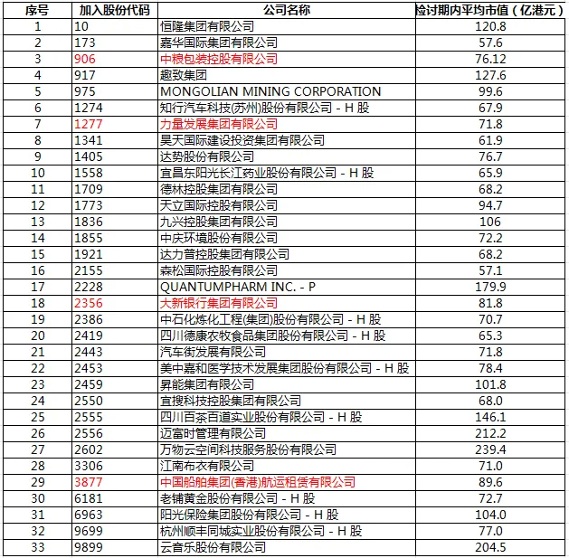 本次恒生综指共纳入了38只标的,删除其中本来就已经在港股通中的5只标的:中船防务(00317)、中外运(00598)、华电国际(01071)、浙商银行(02016)、中集集团(02039)之后,还剩33只标的。这些标的考察期内(2023年7月至2024年6月)的月末平均市值情况如下: