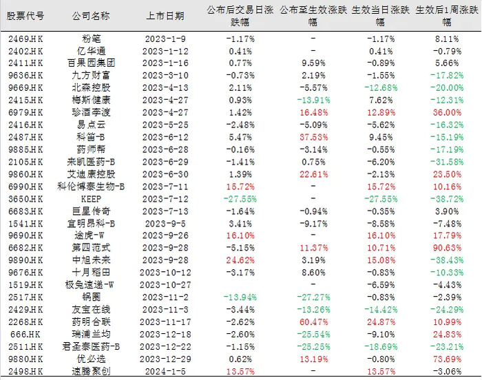 从上表可以看到,在公布至生效期间,涨幅在10%以上的股票有珍酒李渡、科笛B、艾迪康控股、第四范式,而公布当日跌幅在10%以上的股票有梅斯健康、友宝在线、瑞浦兰均、以及君圣泰医药。