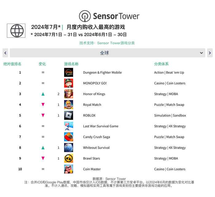 2024年7月全球手游收入榜