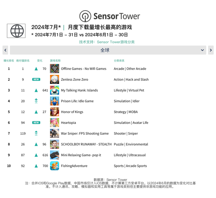 2024年7月全球手游下载量增长榜