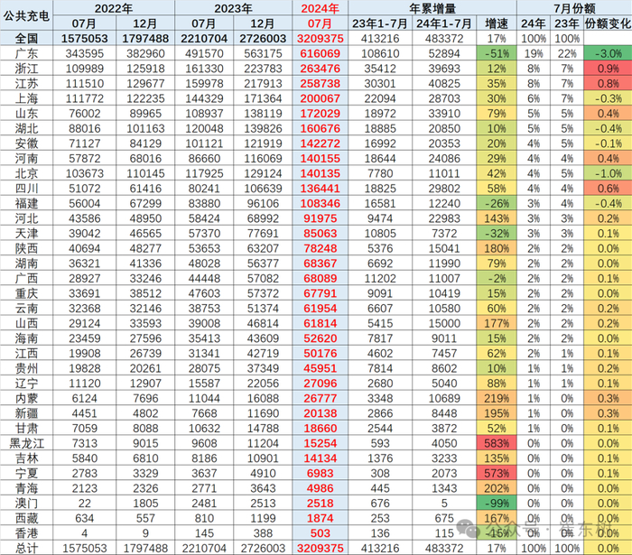 2024年1-7月广东的公共充电桩数量增长5.3万个,充电桩份额也达到了19%,去年1-7月增量10.9万个,份额达到22%,今年份额有所下降。