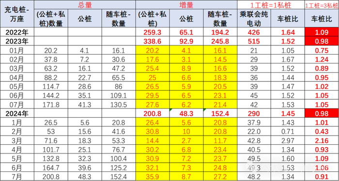 2024年1-7月的纯电动乘用车国内零售290万台,新建48万个公桩和152万个私桩。纯电动乘用车的国内零售规模,公共充电桩如果与私桩看做1:1的用户服务数量对比,则车桩比是1.45:1,充电桩是相对充足的。这里要拆分出插混充电较少的特殊性。也就是上海模式的,只烧油不充电的需求特色。