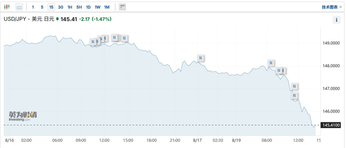 在市场目光集中在将于本周晚些时候召开的杰克逊霍尔全球央行年会之际,在美元表现较为疲弱的情况下,日元周一跳涨。截至发稿,美元兑日元汇率跌1.47%,报1美元兑145.41日元。