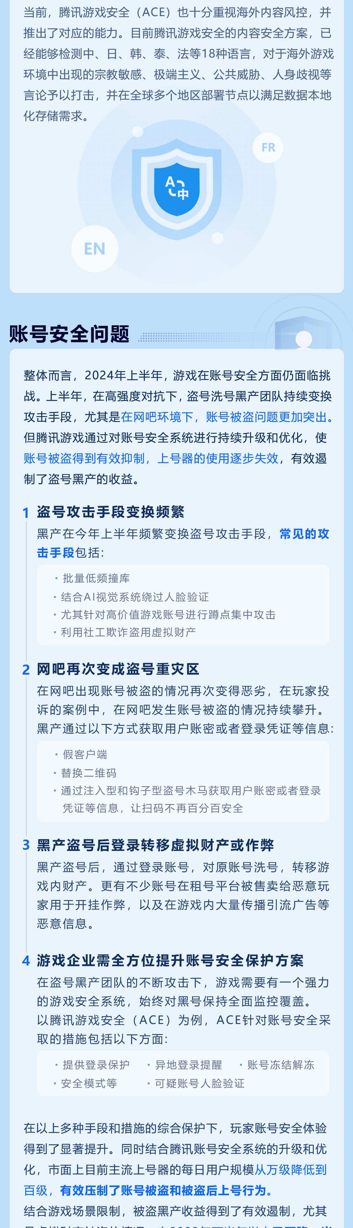 2024年上半年,游戏在账号安全方面仍面临挑战。上半年,在高强度对抗下,盗号洗号黑产团队持续变换攻击手段,尤其是在网吧环境下,账号被盗问题更加突出。