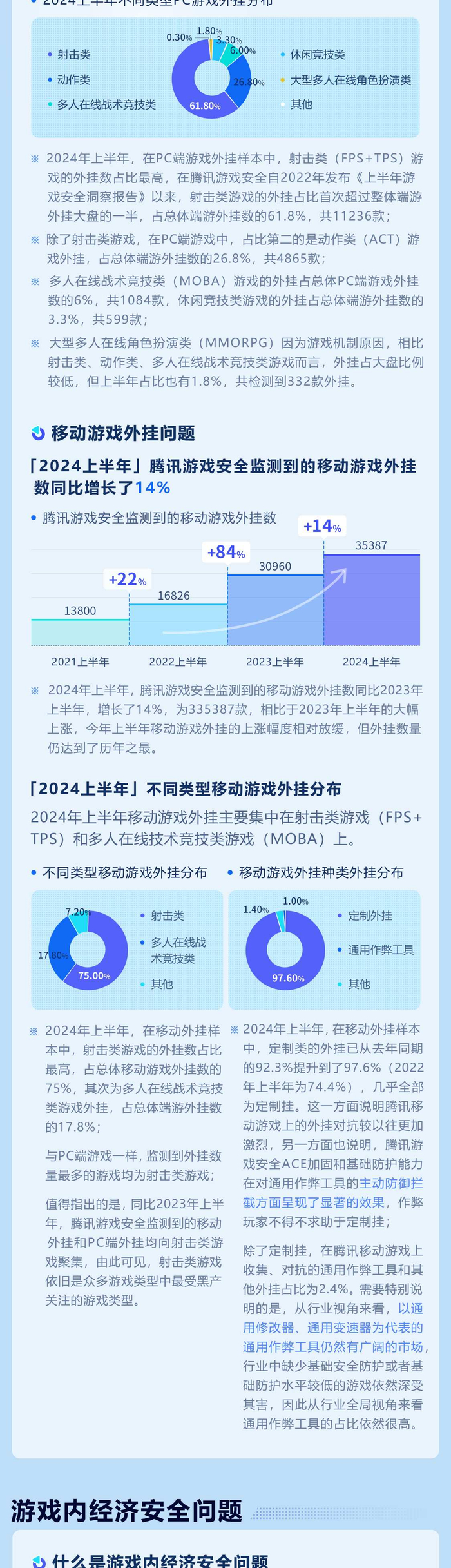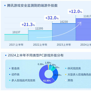 2024年上半年,腾讯游戏安全监测到的移动游戏外挂数同比2023年上半年,增长了14%,为335387款,相比于2023年上半年的大幅上涨,今年上半年移动游戏外挂的上涨幅度相对放缓,但外挂数量仍达到了历年之最。移动游戏外挂主要集中在射击类游戏(FPS+TPS)和多人在线技术竞技类游戏(MOBA)上。