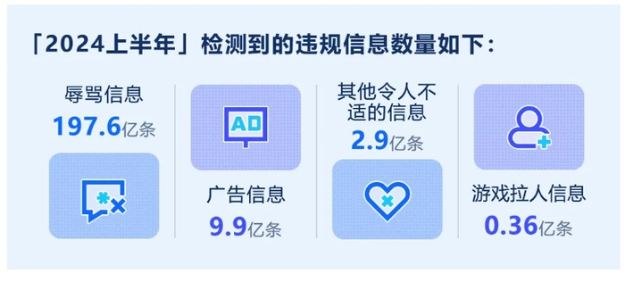 2024年上半年,腾讯游戏安全检测到的辱骂信息197.6亿条,辱骂信息仍是游戏中最容易出现的违规内容。其次为广告类信息、和令人不适的信息、以及游戏拉人等信息。