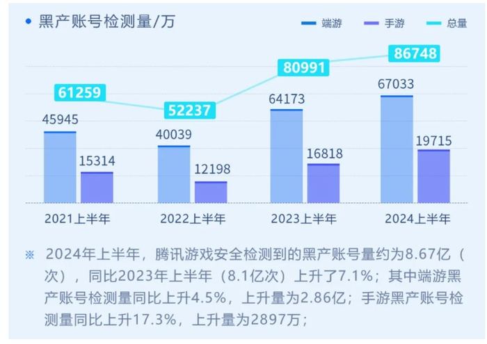 游戏黑产账号主要通过一些违规脚本在游戏进行各类违规行为,破坏游戏的平衡性。据腾讯游戏安全统计,2024年上半年,检测到的黑产帐号量超过8.67亿次,同比上升7.1%。