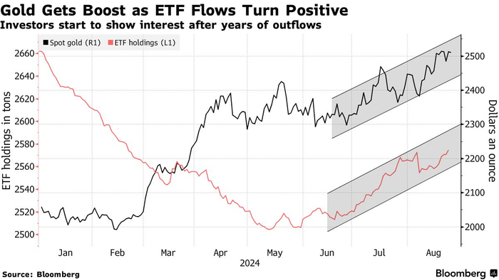 目前,花旗集团预计,在6至12个月内,流入ETF的资金将“显著”扩大,宽松的货币政策以及衰退风险之下波动性的潜在增加趋势将提振黄金需求。该行在鲍威尔于杰克逊霍尔发表讲话前的一份报告中表示,预计2025年中期,黄金交易价格可能达到3000美元。