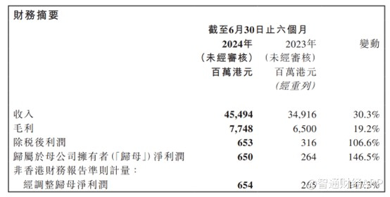 2024年上半年,TCL电子实现营业收入454.94亿港元,同比增长30.3%,毛利77.48亿港元,同比增长19.2%,经调整归母净利润6.54亿港元,同比大幅增长147.3%。
