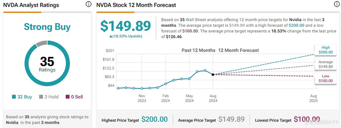 根据TipRanks的数据,总体而言,华尔街分析师予英伟达“强劲买入”评级,平均目标价为149.89美元,较当前水平高出18.5%。