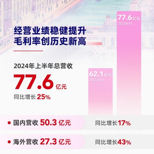 截至2024年6月30日,名创优品品牌全球门店数达6868家,净新增门店455家。其中,国内门店数4115家,净新增门店189家,在渠道高质量拓展的基础上,同店销售表现保持极强的韧性,收入同比增长16%,领先于行业。得益于此,国内营收超50亿元,同比增长17%,实现稳健增长。
