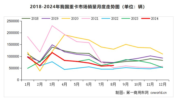 第一商用车网谢光耀表示,6.1万辆放在最近八年来看,仅高于2022年8月(4.62万辆)和2021年8月(5.13万辆),低于其他年份的8月份销量。累计来看,2024年1-8月,我国重卡市场销售各类车型约62.4万辆,累计增速进一步缩窄至0.45%。