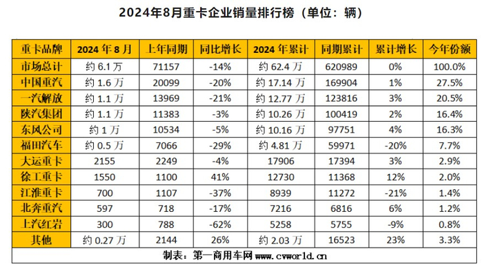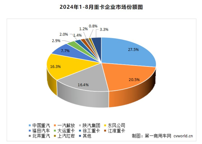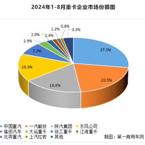 具体来看,中国重汽8月份销售重卡约1.6万辆,保持行业第一;其1-8月累计销售约17.14万辆,同比增长1%,市场占有率上升到27.5%,上涨了0.1个百分点。