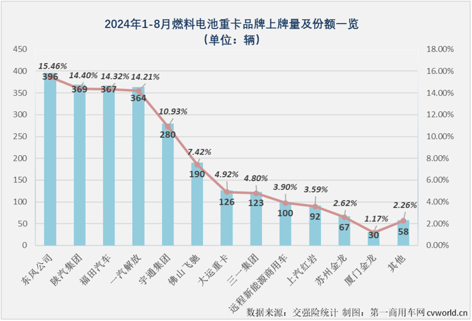 今年1-8月,燃料电池重卡市场已有20位“玩家”参与竞争,其中有9家企业累计销量已超百辆。上图可见,目前燃料电池重卡市场的竞争非常激烈,排名前4位的东风、陕汽、福田和解放销量均超350辆,相邻企业间差距非常小,陕汽、福田和解放三家企业两两相差都不超过5辆,排位竞争非常刺激。此外,宇通、飞驰、大运、三一和远程等企业目前累计销量也破百。