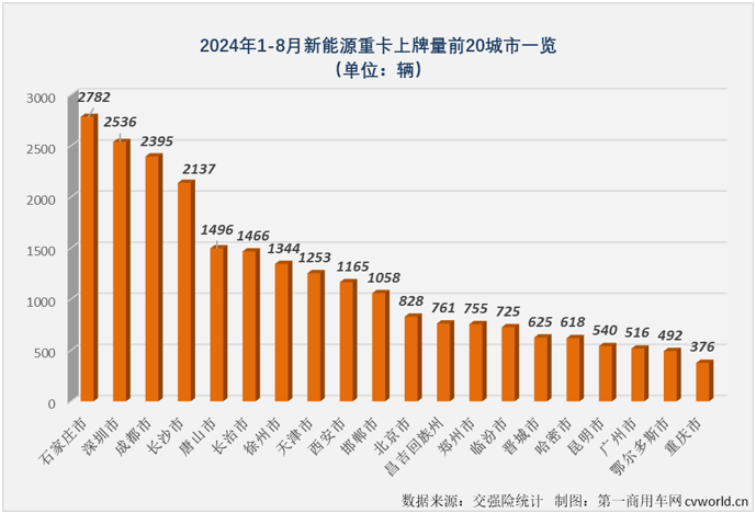 2024年1-8月,全国31个省(市、区)都有新能源重卡挂牌上路,实际上在2024年首月,新能源重卡在全国各地的渗透就已全面铺开。截止到8月份,今年全国已有13个省份新能源重卡上牌量超过1000辆,河北省上牌量已超过6000辆,山西、广东、四川、湖南等省份上牌量均超过3000辆。具体到城市来看,2024年1-8月,全国有新能源重卡上牌的城市已达到276座,其中上牌量超过200辆的城市达到39座,超过300辆的城市都有26座,石家庄、深圳、成都和长沙等4座城市上牌量均已超过2000辆。