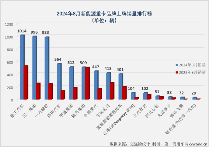 8月份,徐工以1014辆的销量摘冠,斩获自己今年第5个新能源重卡月榜冠军;三一和解放分别以996辆和983辆排名2、3位,解放再次刷新了自己在新能源重卡市场的最高单月销量;福田(600166.SH)以564辆的销量排名第4位,创造了自己今年最高单月销量和最高月榜排名;排名月榜第5、6位的宇通和陕汽销量也均超500辆,分别达到512辆和509辆;重汽(03808)、东风和远程分列8月份月榜第7-9位,销量均超过400辆,分别达到447辆、418辆和401辆;江淮和红岩8月份销量也双双破百,列月榜第10、11位。