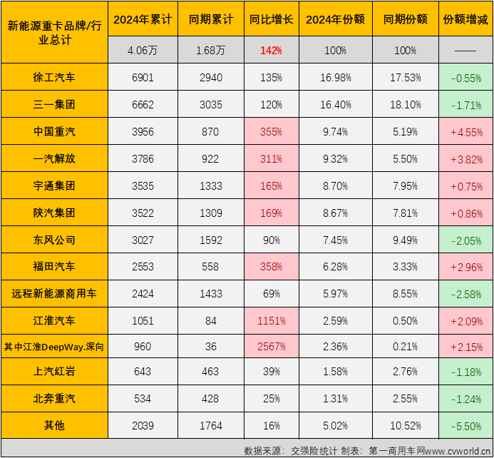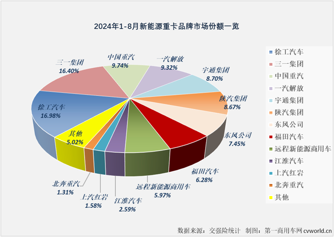 上表可见,2024年1-8月,新能源重卡市场累计销售4.06万辆,同比增长142%,累计销量增幅较7月过后(+148%)有所缩窄。具体到主流企业来看,只有增长一种声音。这其中,重汽、解放、宇通、陕汽、福田和江淮等企业均跑赢新能源重卡市场整体增速;排名前两位的徐工和三一今年1-8月累计销量同比分别增长135%和120%,两家企业均是在去年同期销量已经很高的情况下双双实现翻倍增长,增幅虽然低于市场整体增速,但其增长的含金量其实是非常高的。徐工和三一为今年1-8月新能源重卡市场分别贡献了接近4000辆和超3600辆的增量。