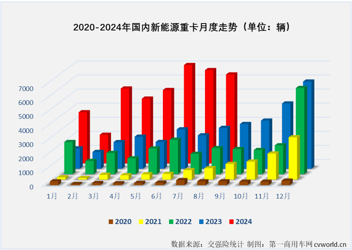 上图可见,代表2024年的红色柱体一直非常“耀眼”,无论是整体看,还是只看单月,都比之前几年明显高出一截。尤其是最近的6、7、8三个月,刚好就是新能源重卡市场有史以来销量最高的三个月。截止到2024年8月,新能源重卡月销量共5次超过6000辆,其中的3次就发生在最近的6-8月,之前的3-5月销量也不低(5000辆左右),从销量数据来看,当下新能源重卡行业正处在第一个鼎盛时期。