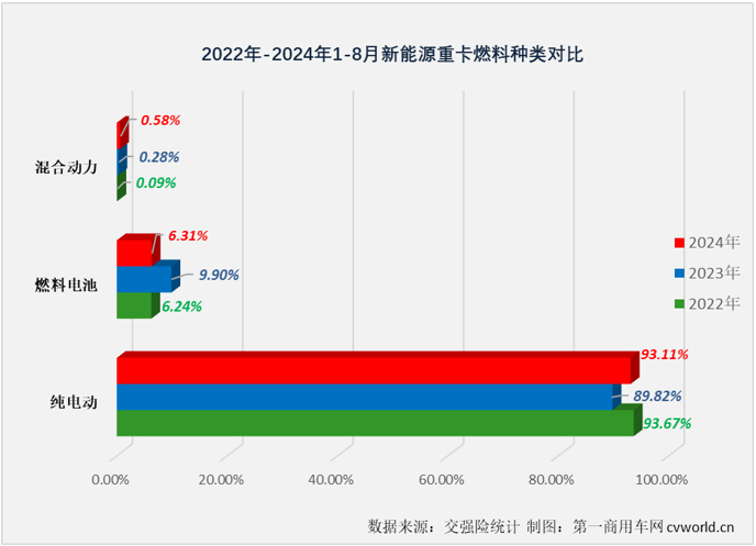 第一商用车网注意到,2024年以来,新能源重卡市场延续了以纯电动为主要技术路线的特点:今年1-8月,燃料电池重卡和混合动力重卡在整个新能源重卡市场合计仅占到6.89%的份额,余下93.11%均为纯电动车型(这一占比比去年同期以及2023年全年都高,但略低于2022年同期占比,如下图)。