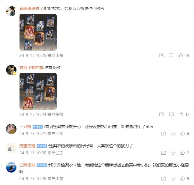 祖龙娱乐行业内顶级的产品力也获得了玩家的认可,《龙族:卡塞尔之门》以其独特的魅力和创新的游戏设计,为玩家带来了全新的游戏体验,在多个社交与游戏平台上令玩家交口称赞。公测以来,龙族IP灵魂人物绘梨衣引发了玩家群体的强烈共鸣,话题#绘梨衣cos#登上抖音热榜,全网2700w播放,公测主题曲发布3日播放近300万次,音乐区第1全站第6。随着9月15日绘梨衣限时活动的开启,玩家对于游戏的热情被进一步激活,官方评论区下方随处可见各种“欧皇晒卡”截图。