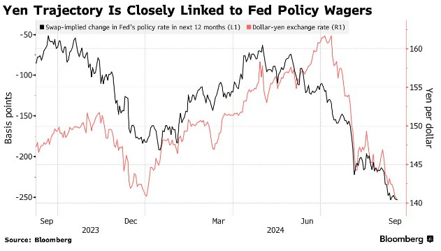 日元的走势与美联储降息预期密切相关。周一,随着有关降息半个百分点的猜测增多,日元兑美元汇率飙升至 140 关口,达到今年的最高水平。