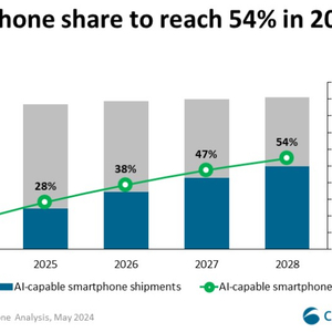 研究机构Canalys发布的研究报告显示,该机构预计2024年全球16%的智能手机出货量为AI智能手机,而到2028年,该机构预计这一比例将呈指数级增长至54%,在2023年—2028年间的AI智能手机市场规模的复合增速(CAGR)将高达63%,主要受消费者对AI全能助手和端侧自动化处理等增强功能需求的强力推动;预计这一转变将率先出现在高端智能手机机型上,然后逐渐为中端智能手机所采用,反映出端侧生成式AI作为更普适性的先进技术渗透整体智能手机市场的趋势。