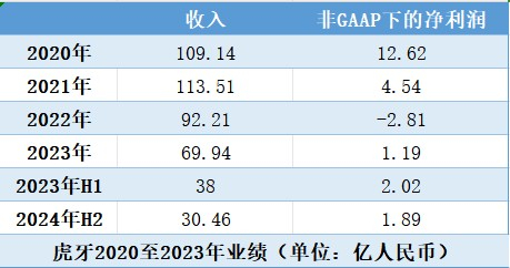 自2021年开始,虎牙的业绩便开始走“下坡路”。2021年中,其收入虽仍增长4%至113.51亿元,但非GAAP下的净利润已大幅下滑至4.54亿元,同比暴跌64%。而在2022、2023年中,其收入分别为92.21亿元、69.94亿元,持续下滑,非GAAP下的净利润分别为-2.81亿元、1.19亿元,利润端大幅波动。