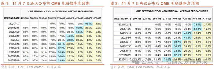 本次会议鲍威尔极力维持了中性姿态,既拒绝前瞻指引、维持数据依赖,又不对大选结果和财政政策过多置评。后续政策可能有三点重要变化:第一,前瞻指引时代落幕。一来政府不愿再被市场“套利”,二来大选之后政策和经济的不确定性将会更高,前瞻指引是更加风险中性的选择;第二,向中性利率靠拢的门槛可能提高。鲍威尔反复强调在向中性利率靠拢时会更加谨慎以实现双重风险平衡,也意味着后续降息的门槛可能会提高,正如鲍威尔的比喻“当我们接近既定目标时,会如同飞机降落般逐渐减缓操作节奏”;第三,12月议息会议会释放更多信号。目前共和党非常有望拿下众议院,若如此美联储模型参数可能会出现更多变化,并反映在12月的点阵图和SEP中。