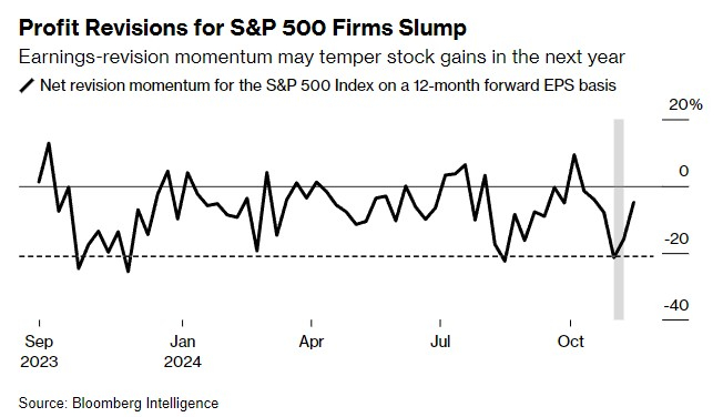 在过去十年的大部分时间里,企业盈利一直是股市上涨的基石。在今年的上涨导致估值过高、仓位增加的背景下,利润增长前景恶化可能削弱标普500指数的进一步上涨。该基准指数已连续第二年上涨,涨幅超过20%,处于2021年4月以来的最高水平。