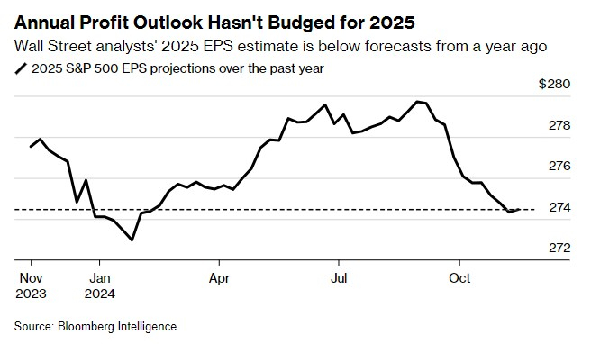 尽管分析师上调了第三季度的预期,但2025年全年的盈利前景几乎没有变化。根据BI汇编的数据,华尔街预计标普500指数成份股公司明年的每股收益约为274美元,略低于一年前约277美元的预测。